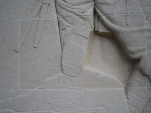 The second panel, Stretcher Bearers, has a similarly claustrophic qualityand if you look closely you can see how tightly the wounded man is gripping the side of the stretcher. As Ann Compton notes in her book, The Scuplture of Charles Sargeant Jagger (p71 2004), it “takes up the theme of his early work in confronting the reality of injury and death among the troops.”