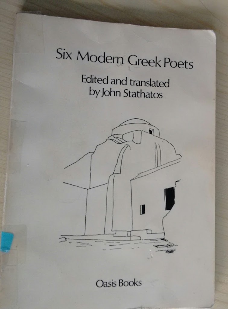 I began with Six Modern Greek Poets, edited and translated by John Stathatos and published in the UK by Oasis books. The names of the poets were familiar; George Seferis, Takis Sinopoulos, Yannis Ritsos and some less familiar Aris Alexandrou and as I was pleased to see one female poet, Eleni Vakalo. Ritsos remained one of my favourites with his short poems that contain the whole of a life, like ‘Return of Deserter